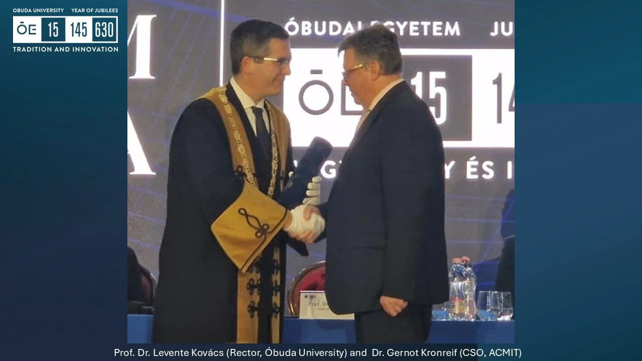 Dr. Gernot Kronreif, Chief Scientific Officer of ACMIT, was awarded an honorary professorship by Óbuda University on November 20, 2025, during a festive celebration marking the university’s 15th anniversary in Budapest.