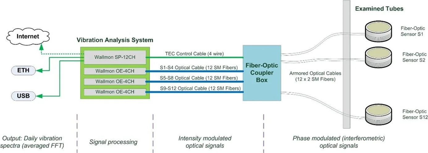 FOSMON measures in-situ and in-operando the wall thickness of heat-exchanging stainless steel tubes in harsh, high-pressure and high-temperature steam environments by applying FFT analysis to their vibration spectrum. The system uses fiber-optic interferometry, where a tightly wound single-mode fiber coil around the tube serves as an intrinsic stress and vibration sensor.